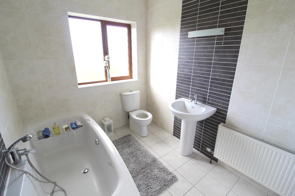 Family bathroom with large bath, fully tiled, whb, wc, widow, shaver light and radiator.