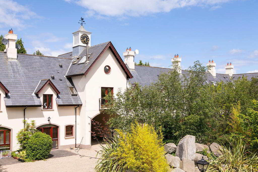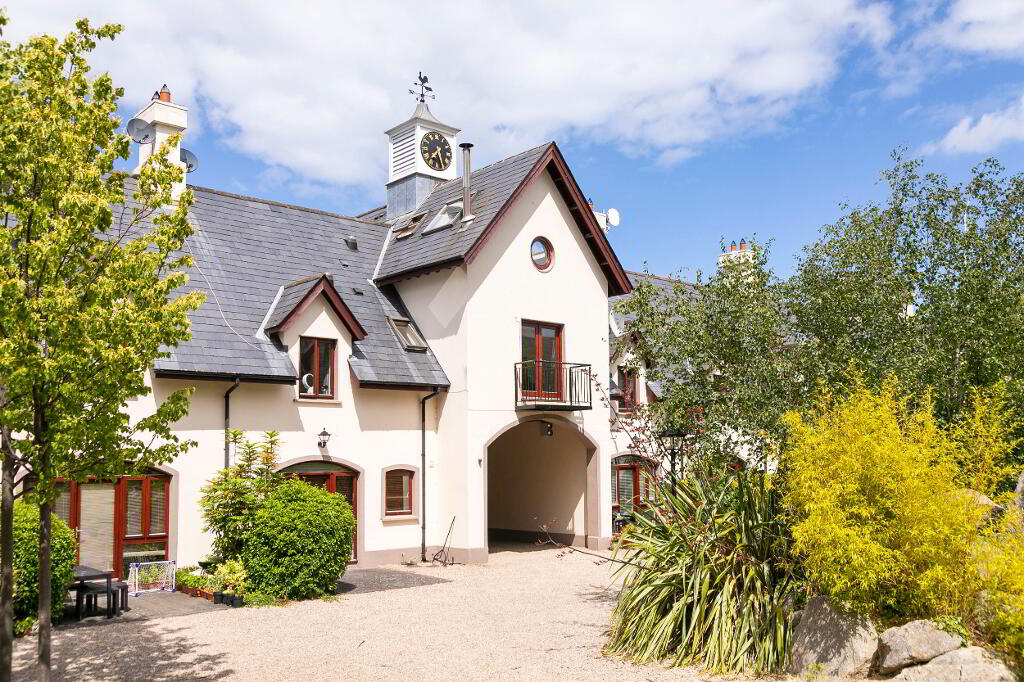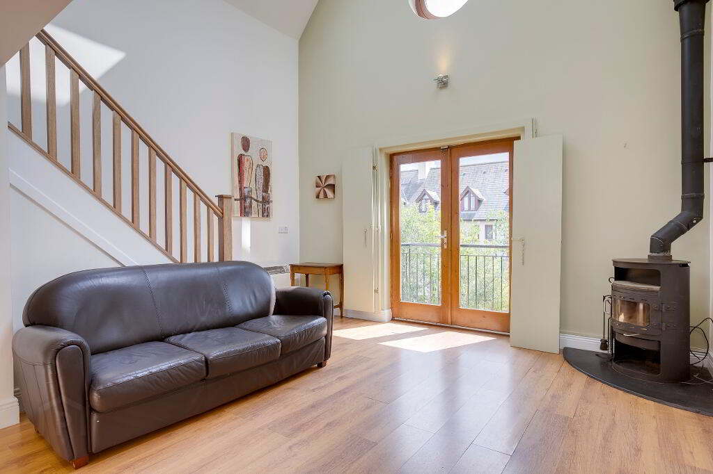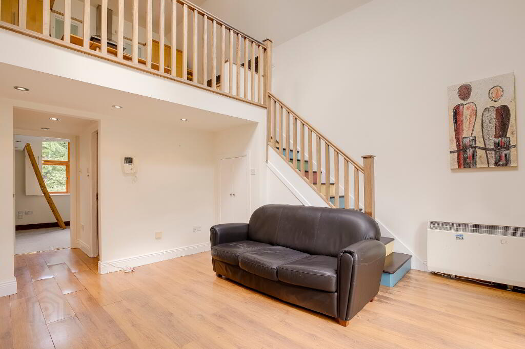 Different by design; stunning duplex own hall door one bedroomed apartment with loft style double height ceilings, gallery mezzanines, wood burning stove, private balcony and bathed in light by large skylights and porthole window. A courtyard style development in a mature sylvan setting with communal grounds set behind electronic security gates; the tranquil, idyllic setting belies the convenient location close to Shankill, Bray, N11 and M50.