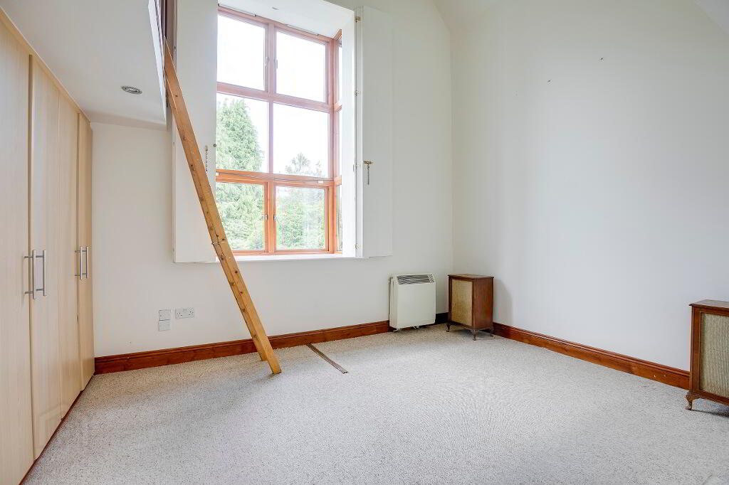 Bedroom: 4.381m x 3.264m. feature double height ceiling and deep bay window, range of built-in wardrobes, carpet, window shutters, stairs to gallery storage area
