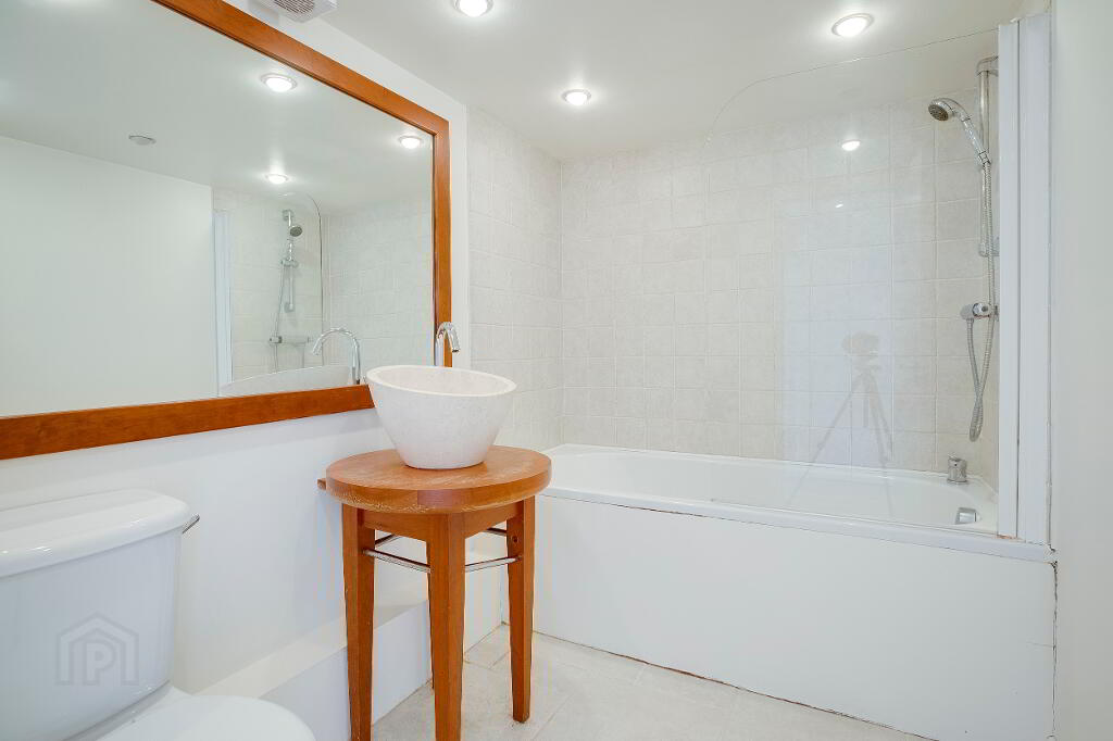 Bathroom: with white suite comprising bath with shower over, freestanding, wash hand basin, wc, recessed lighting, Elicant extractor fan, Dimplex wall mounted heater, part tiled walls, tiled floor