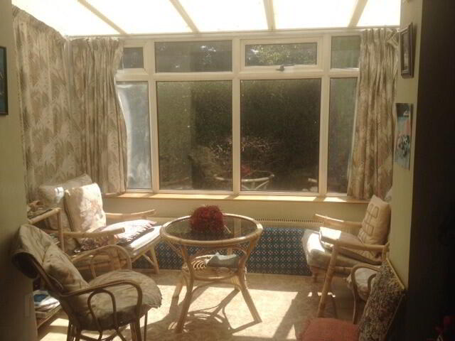Living-dining-sunroom 7.6m x 4.0m carpet & cork flooring, door to rear patio area, 1.85m x 3.05m curtains, open fire,
