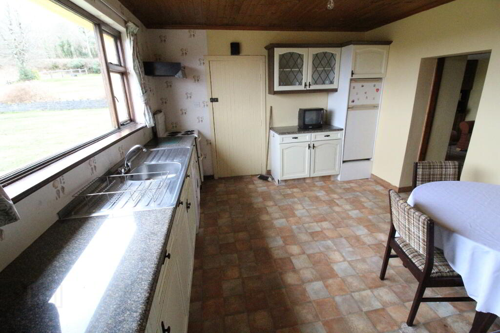 Large window to rear elevation taking advantage of stunning lake views. Range of country cottage style wall and base units, stainless steel sink, plumbed for washing machine, solid fuel range (heats water), lino to floor, radiator, door to gardens.