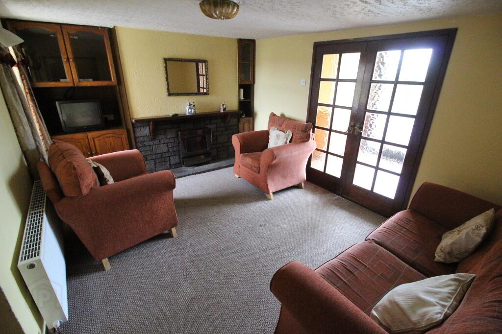 Window to rear elevation with views of Lough Key. Feature fireplace with solid fuel stove with back boiler (independently heats water), built in shelving and cupboards in recesses, ceiling light, two wall lights.