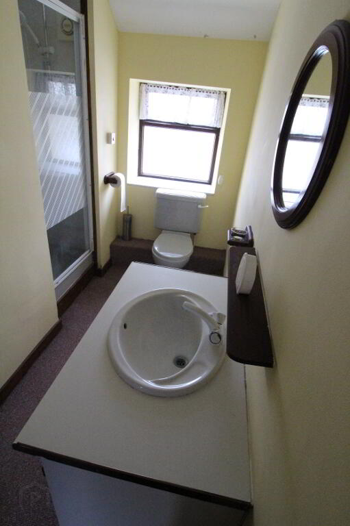 Window to rear elevation, carpet, sink in vanity unit, w.c., tiled shower cubicle with electric shower, recessed spot light in ceiling.