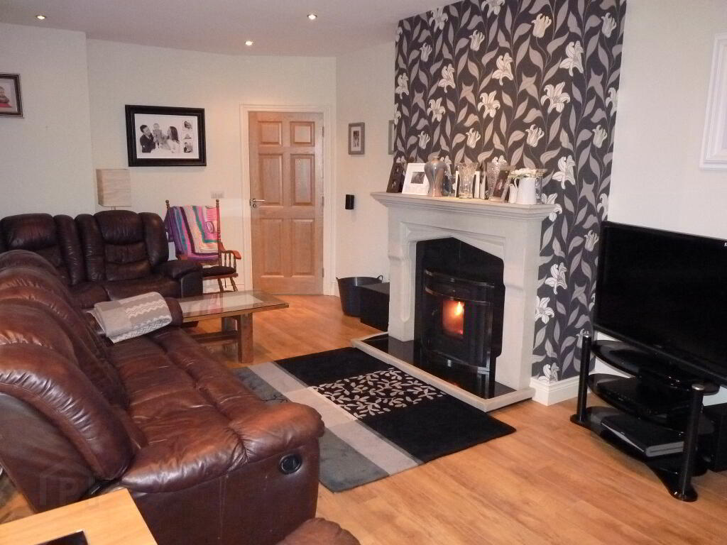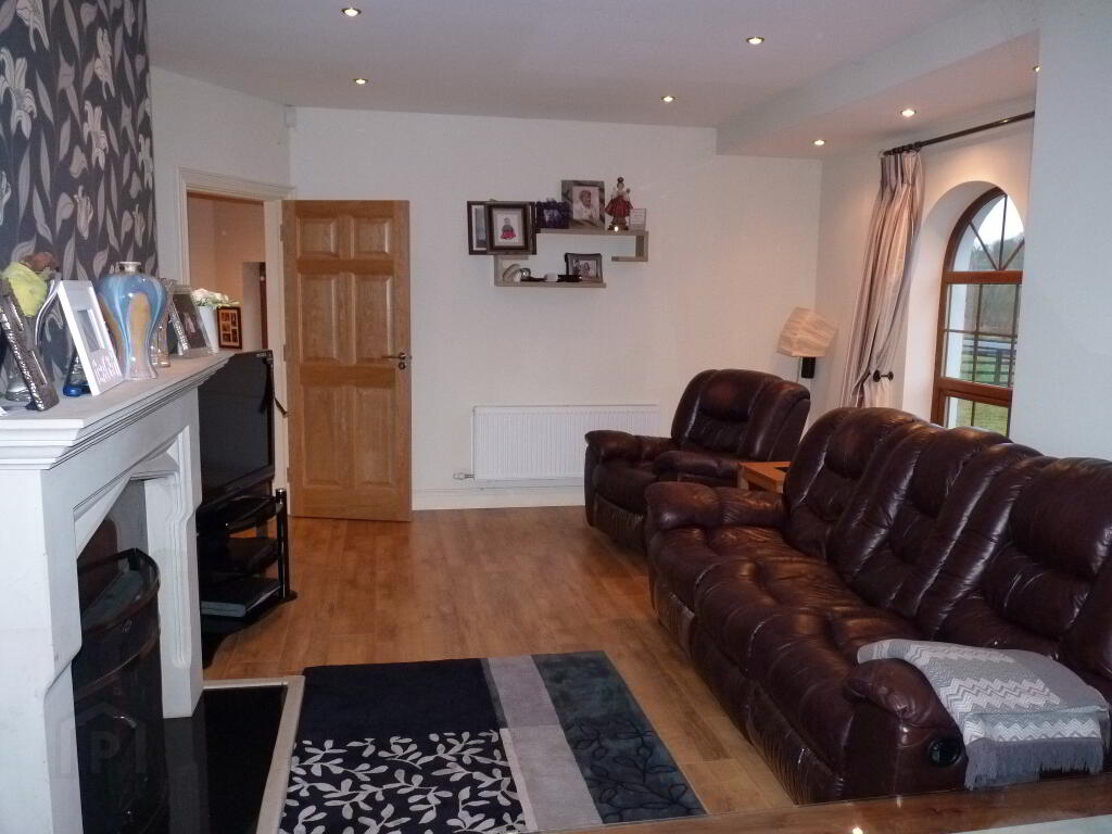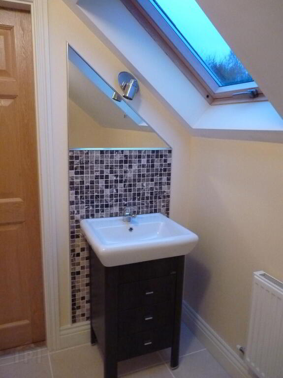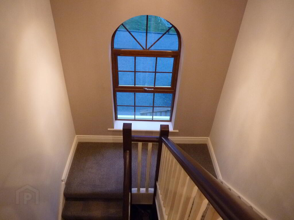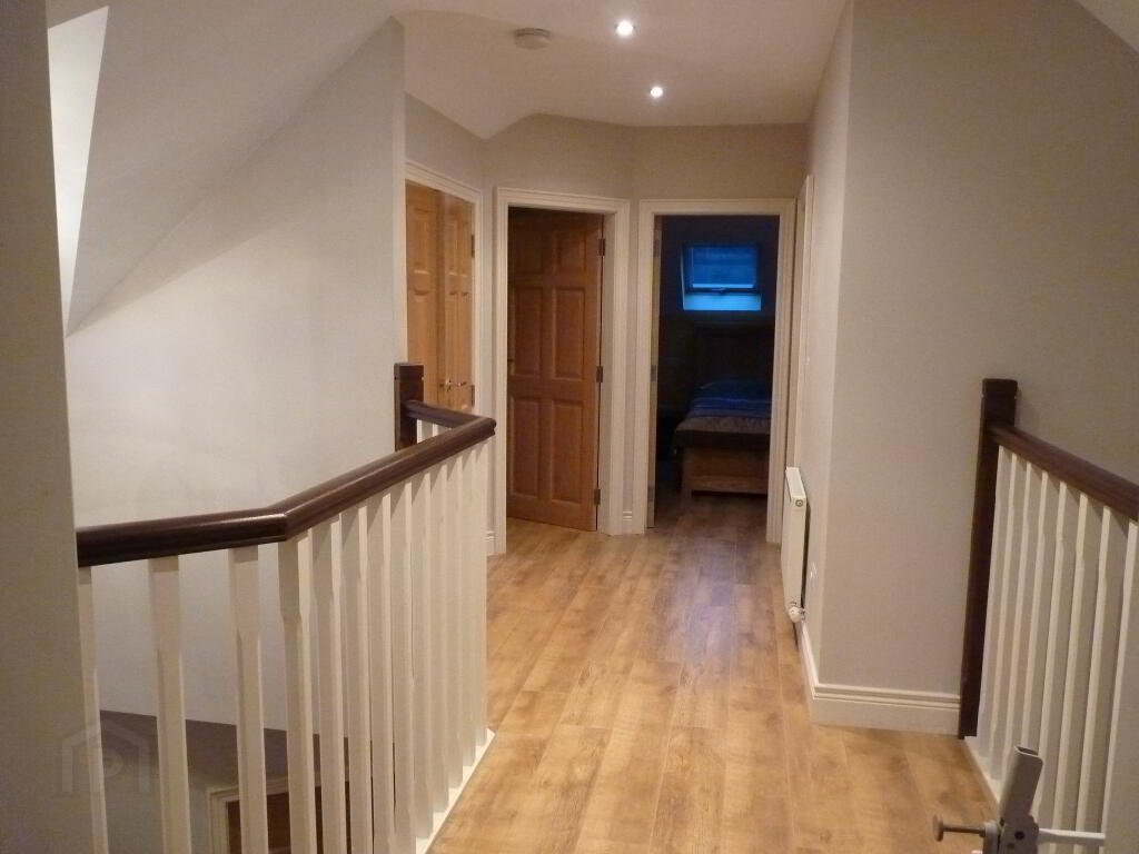 Polished porcelain floor tiles with vaulted ceiling and feature triangular window to front elevation, turning staircase with carpet and arch shaped window to rear elevation on the first landing of the stairs. Oak internal doors, wall uplighters, recessed spot lights, hot press.