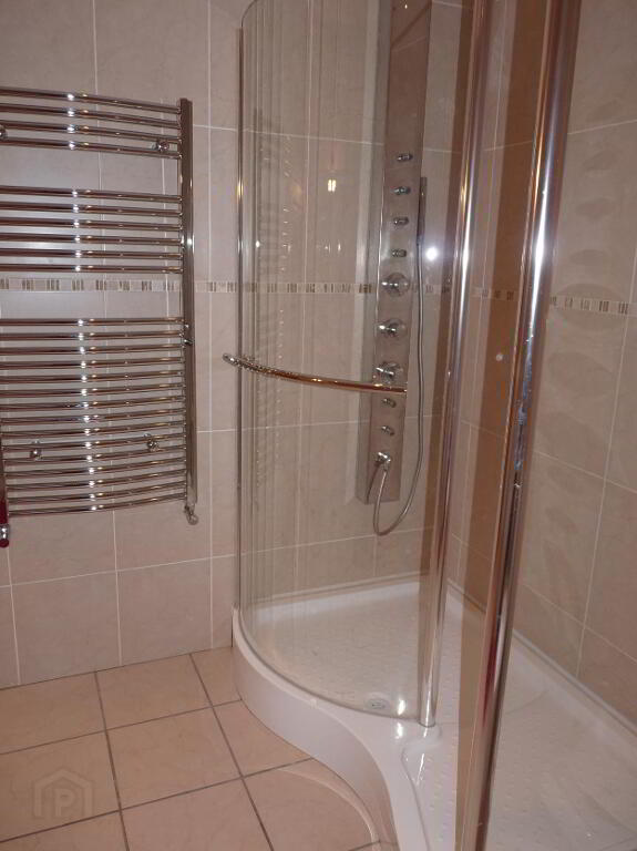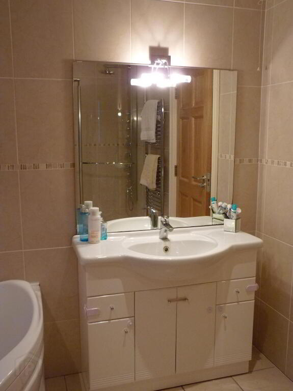 Window to rear elevation, fully tiled, quality corner Spa bath with mixer tap and shower attachment. Separate shower cubicle with mains fed shower, curved glass screen and jet controls, w.h.b. in vanity unit with large mirror and light, w.c., wall mounted chrome heated towel rail and radiator. Recessed spot lights.