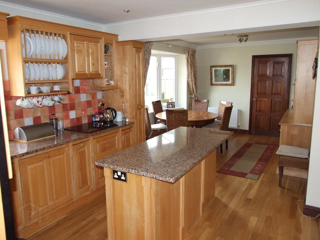 Bay window to rear elevation, solid wood floor, range of wooden wall and base units incorporating larder style fridge/freezer, granite work top, attractive tiled splash back, ceramic hob, electric oven, extractor fan in hood, kitchen island with granite counter and drawers/storage, coving to ceiling and recessed spot lights.