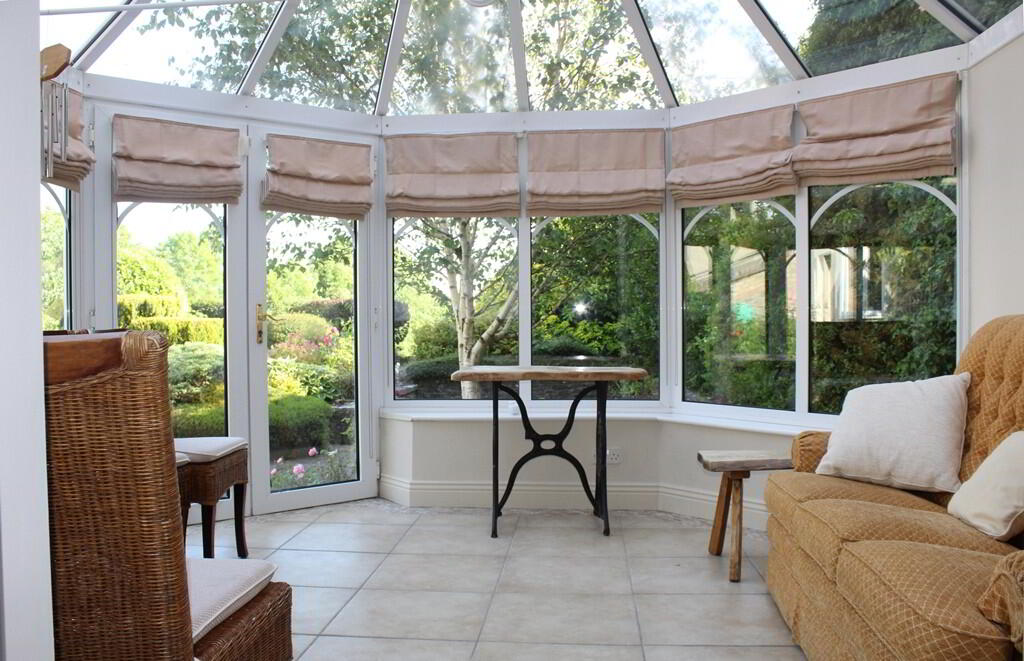 Tiled floor. French doors out into garden. Wall and ceiling light.
