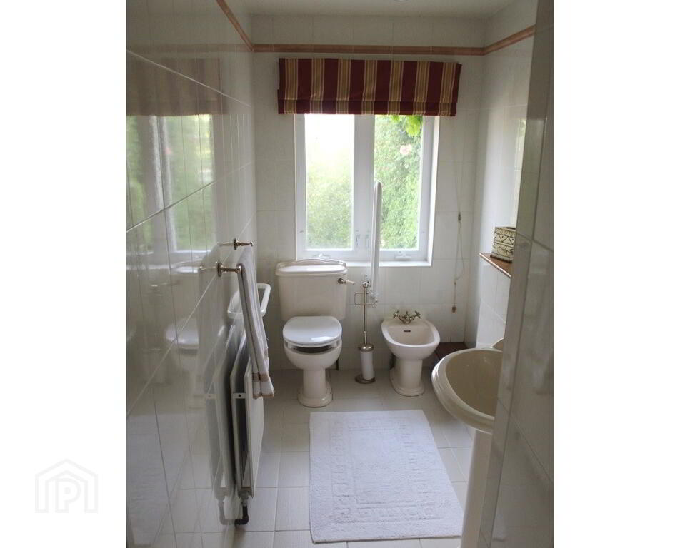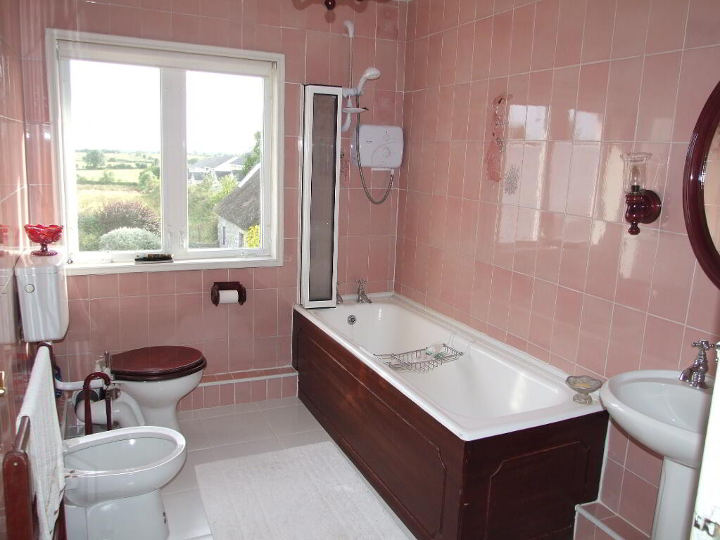 Fully tiled, w.c., bidet, w.h.b., wall mirror, large double shower cubicle and electric shower with brass shower head and controls. Wall light, radiator.