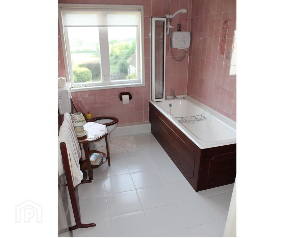Large window to rear elevation. Fully tiled. Bath with overhead electric shower. W.c. and w.h.b. Attractive lantern style ceiling light with two matching wall lights either side of mirror.