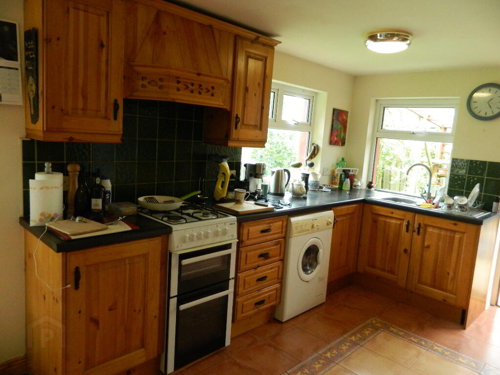 Tiled floor, dual aspect windows and French doors into garden. Range of wall and base units, tiled splash back, plumed for washing machine, side door onto patio.