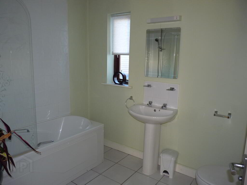 Tiled floor, window, bath and overhead shower with screen, tiled splash back, w.c., w.h.b., with tiled splash back, mirror and wall light with shaver point.