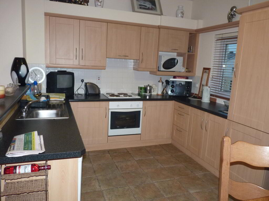 Fully fitted kitchen with a range of wall and base units and tiled splashback. Plumbed for washing machine and dishwasher. Oven and hob, stainless steel sink, breakfast bar, smoke alarm.
