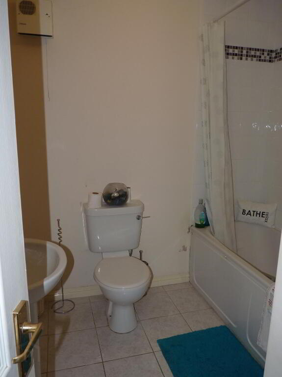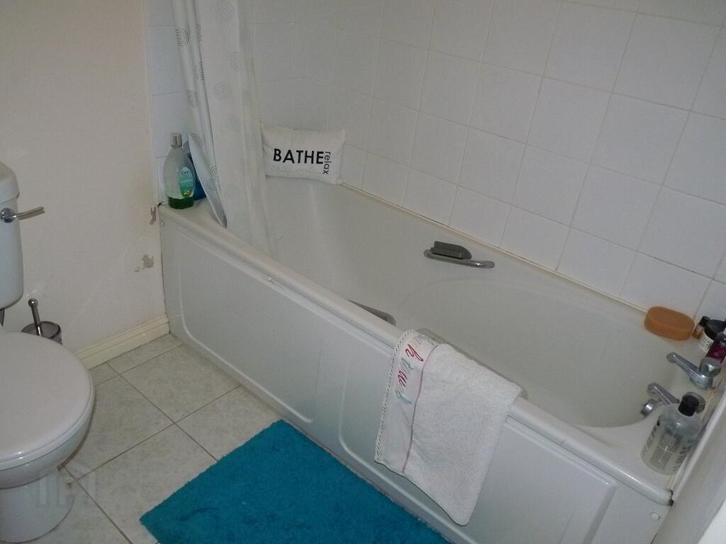 Tiled floor, Dimplex wall heater, w.c., w.h.b., with tiled splash back, bath with tiled splash back and overhead shower fitting, mirror, wall light with shaver point. Loft hatch.