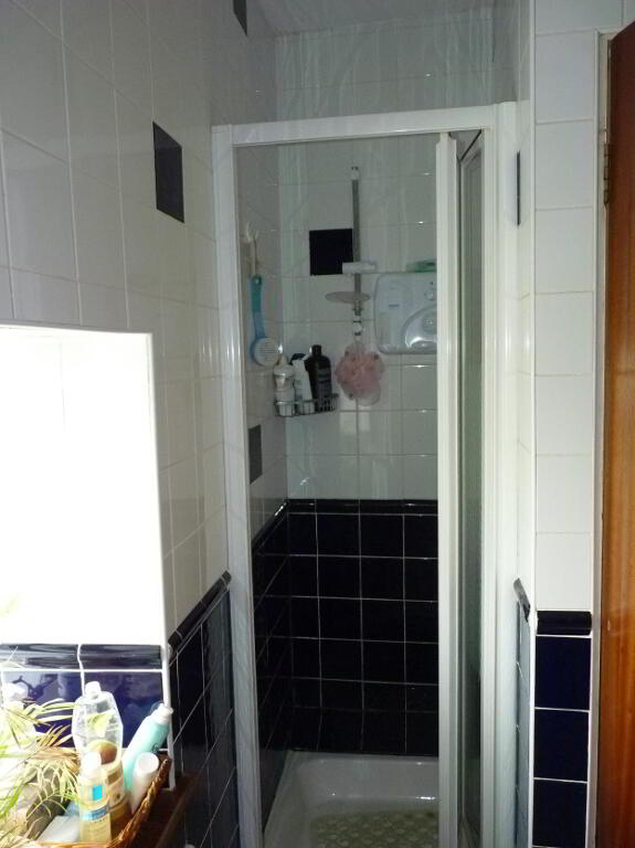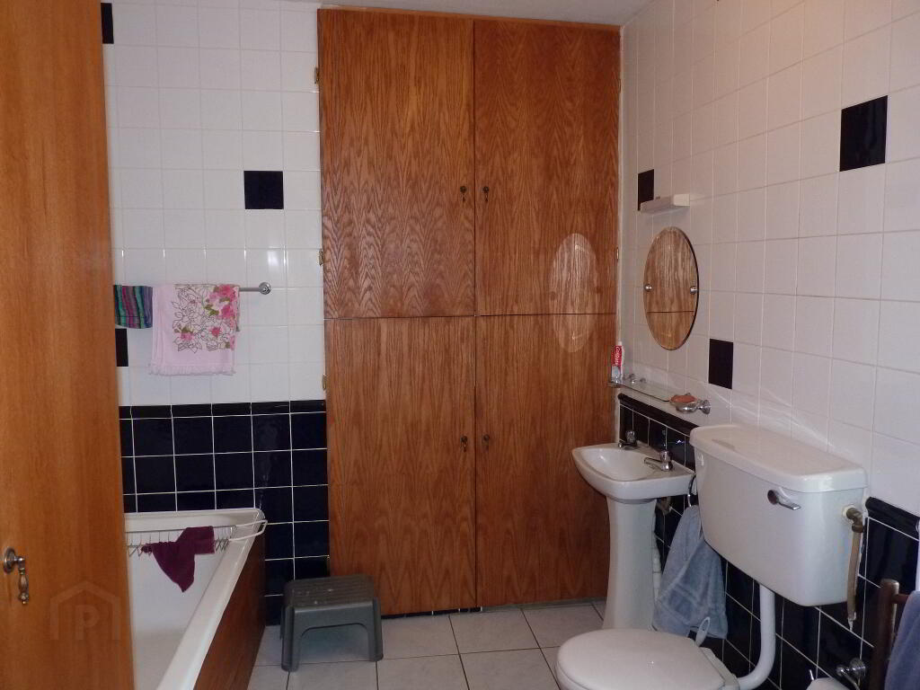 Fully tiled, double glazed window to rear elevation, bath, w.c., w.h.b, separate tiled shower cubicle with electric Trinton Shower, built in storage cabinets, radiator.