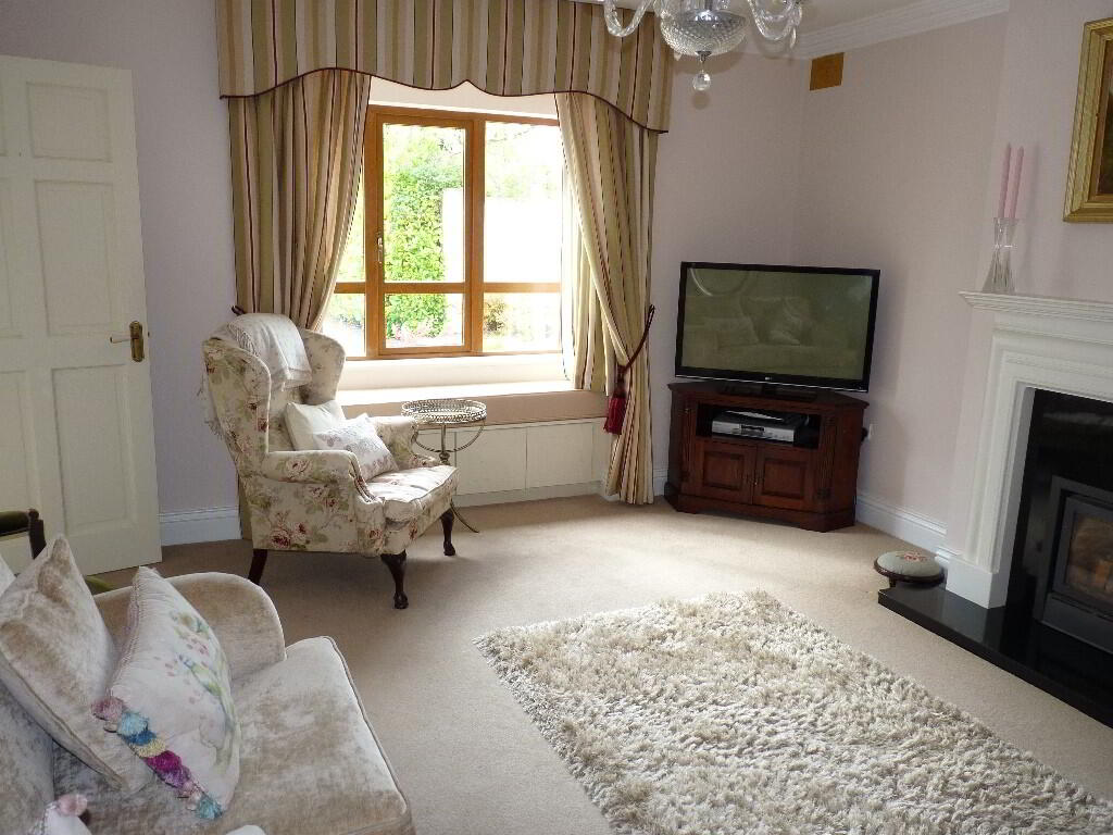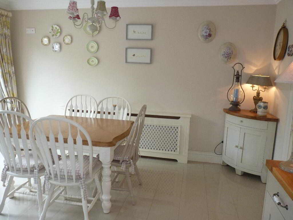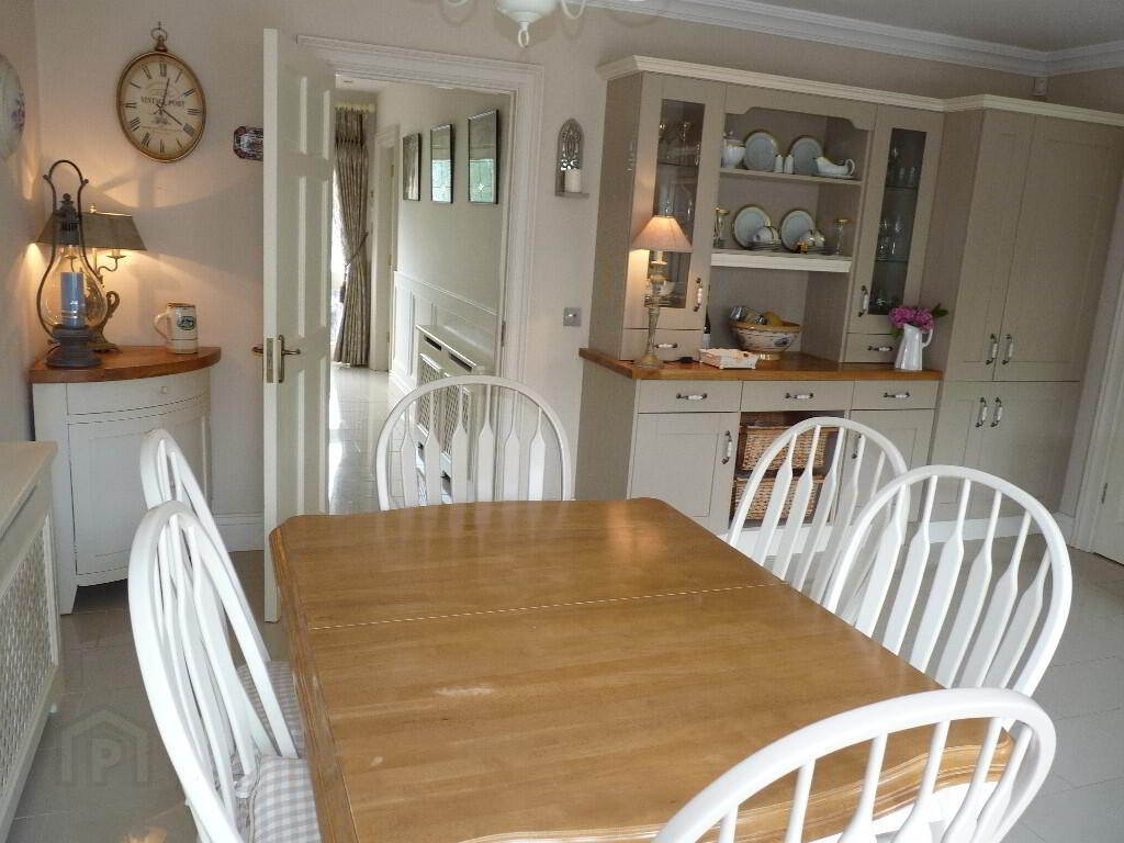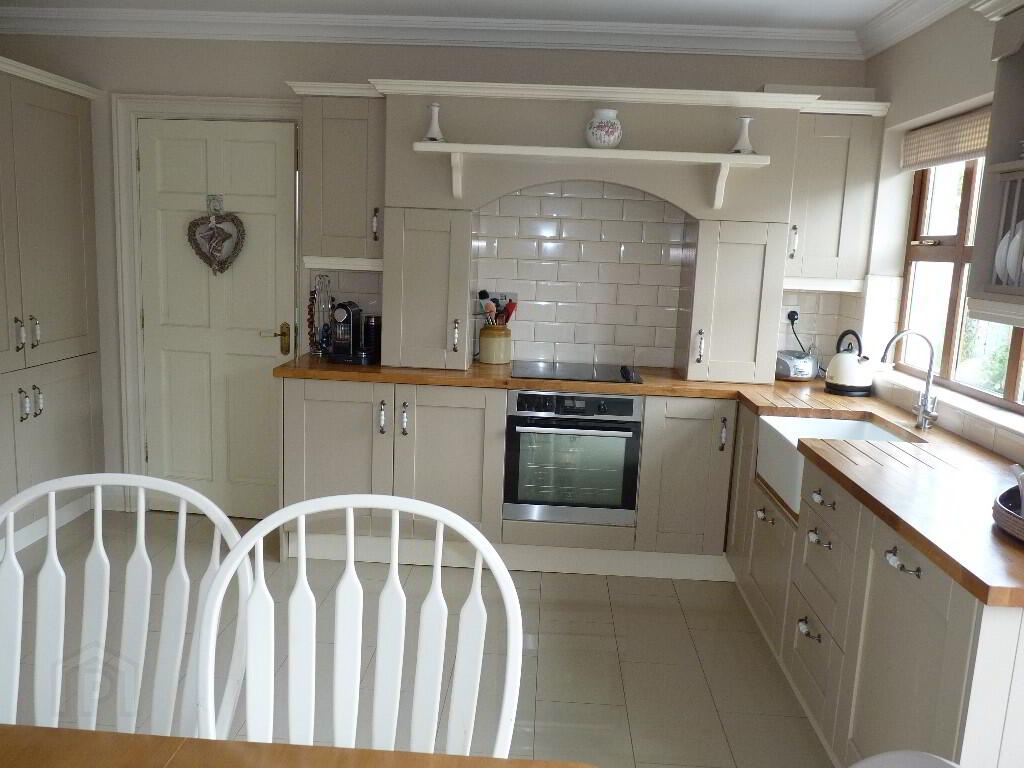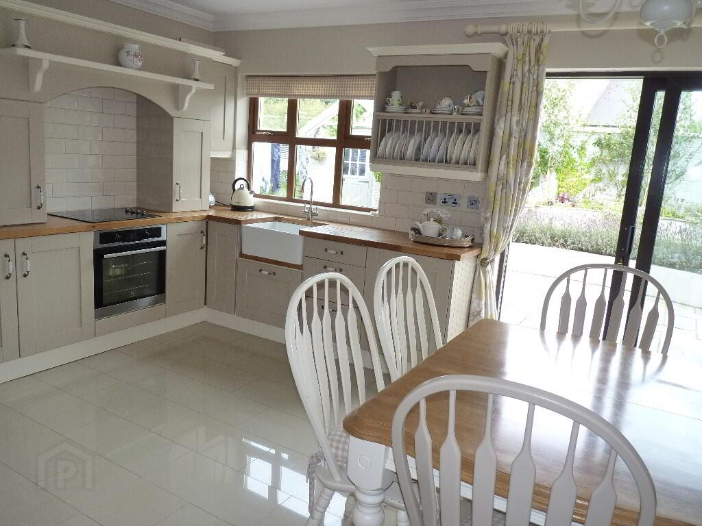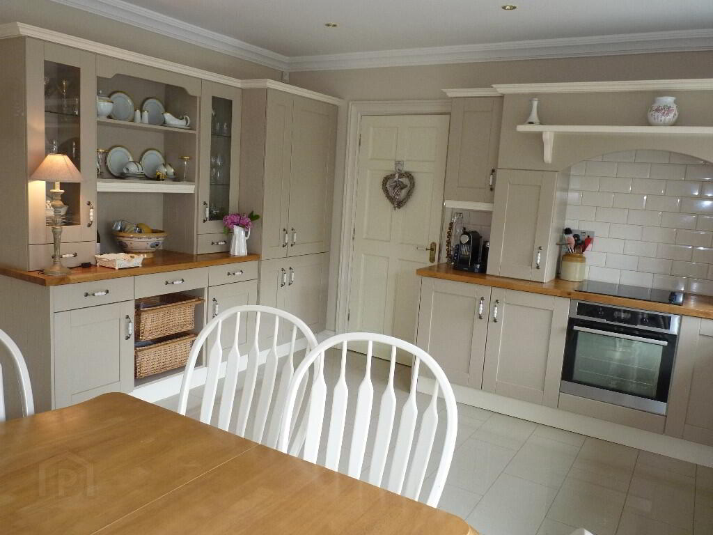 Polished porcelain floor tiles continuing in from hallway. Superb custom built fully fitted kitchen with range of wall and base units, solid wood counters, tiled splash back, Butler sink, integrated fridge/freezer and dishwasher, window to rear and patio doors. Ceramic hob, with overhead extractor fan built into attractive fireplace style unit, coving and recessed spot lighting. Dresser style storage unit. Radiator and cover. TV socket on wall. Window and patio door to rear elevation. Door into:-