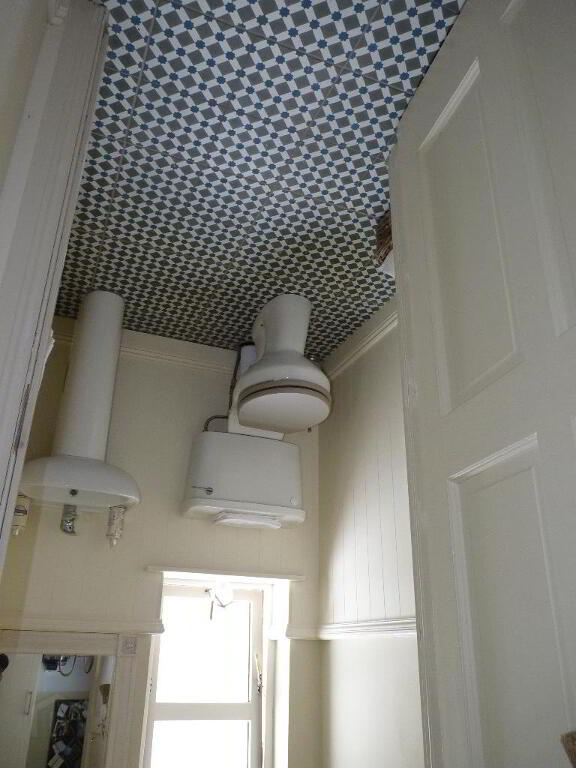 Attractive Victorian style floor tiles, side door to garden, range of storage units (pantry style) with pull out bin. Counter and wall units, plumbed for washing machine. Door into:-