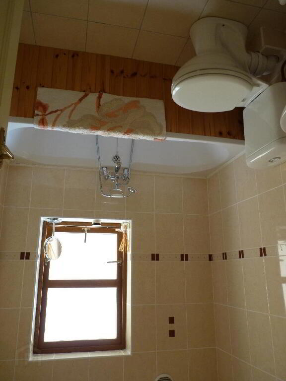Fully tiled with window to side elevation. Bath with timber side panelling, central mixer taps and shower attachment. W.c. and w.h.b. Bathroom cabinet. Wall light, extractor fan and radiator.