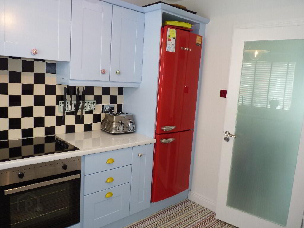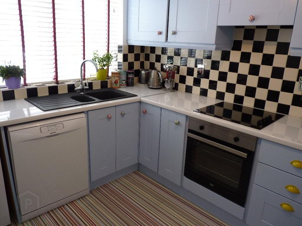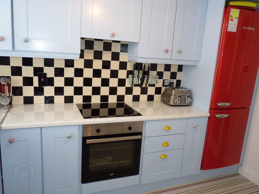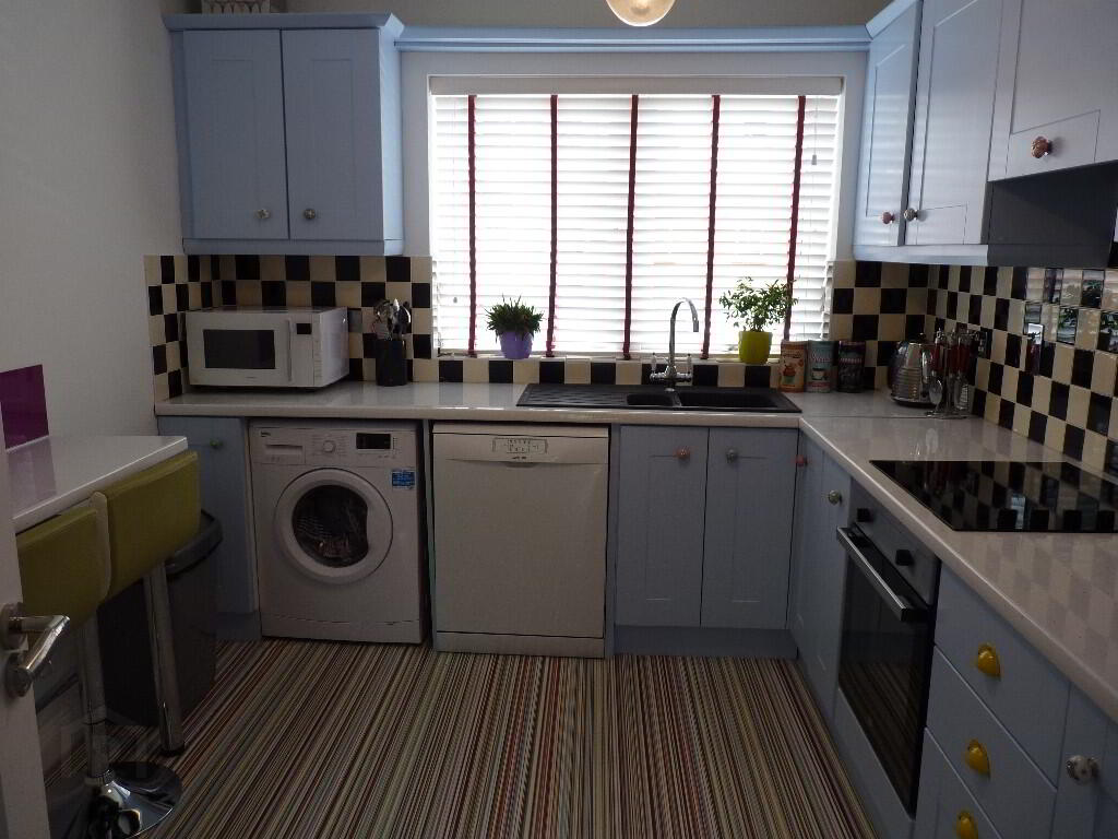 Newly re-modelled fully fitted fun kitchen with a range of sky blue wall and base units with an array of attractive individual non matching handles. Stunning white counter with black sink, ceramic hob, stainless steel oven, built in extractor fan, housing for large Fridge/Freezer. Chequer Board tiled splash back. Plumbed for washing machine and dishwasher. Separate wall mounted breakfast bar with single tile glass splash back. Funky stripey lino to the floor (on top of existing tiles). Dimplex electric wall heater, smoke alarm.
