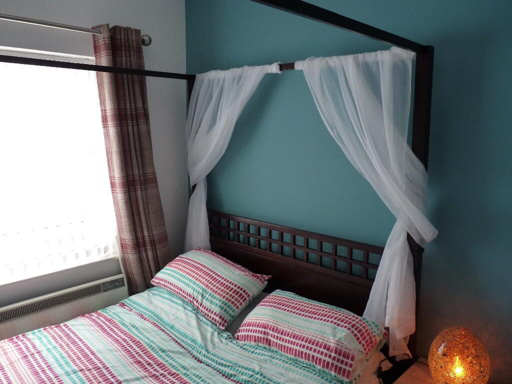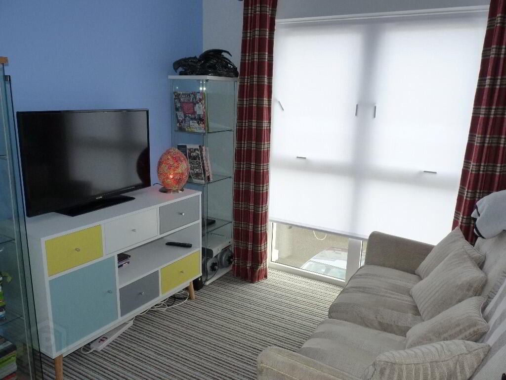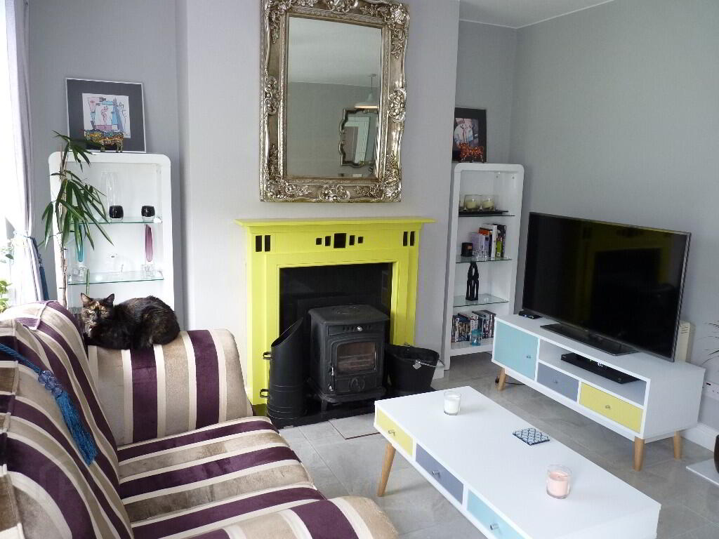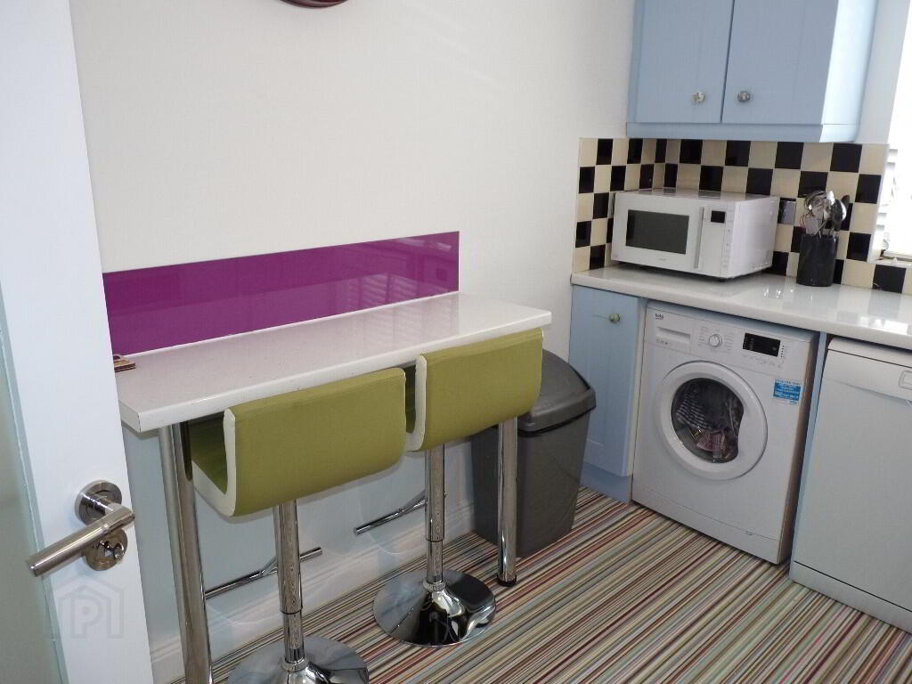 Newly re-modelled fully fitted fun kitchen with a range of sky blue wall and base units with an array of attractive individual non matching handles. Stunning white counter with black sink, ceramic hob, stainless steel oven, built in extractor fan, housing for large Fridge/Freezer. Chequer Board tiled splash back. Plumbed for washing machine and dishwasher. Separate wall mounted breakfast bar with single tile glass splash back. Funky stripey lino to the floor (on top of existing tiles). Dimplex electric wall heater, smoke alarm.