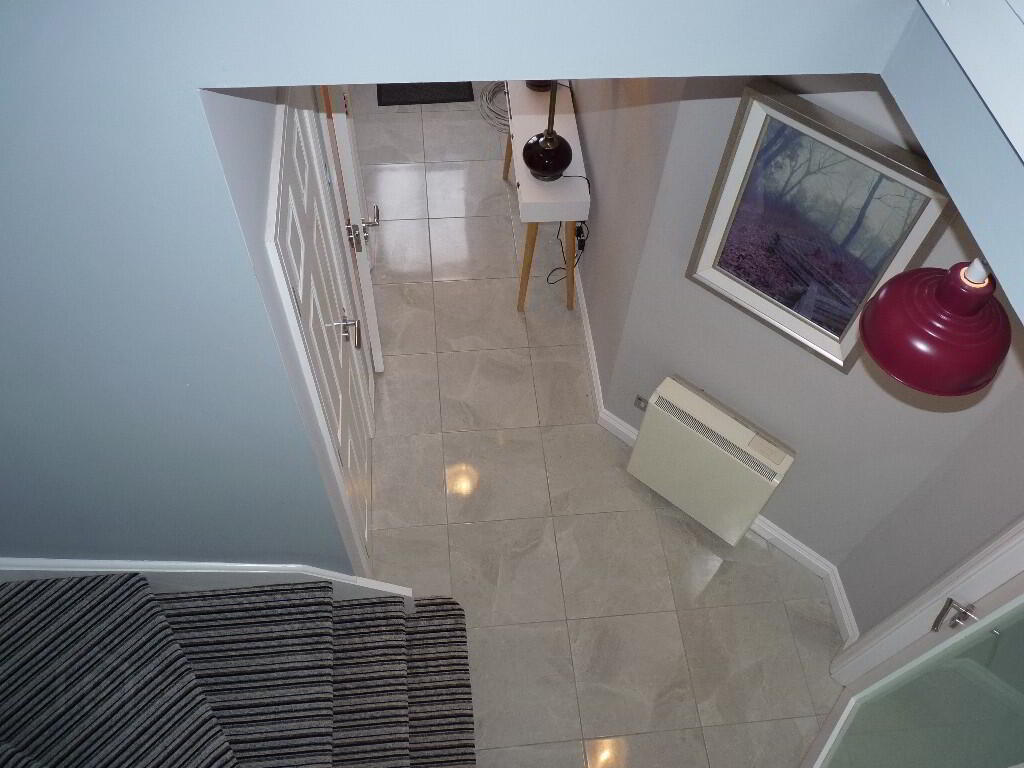 Polished porcelain tiles to floor, door to hot press with immersion, contemporary fully glazed door with frosted glass into:-