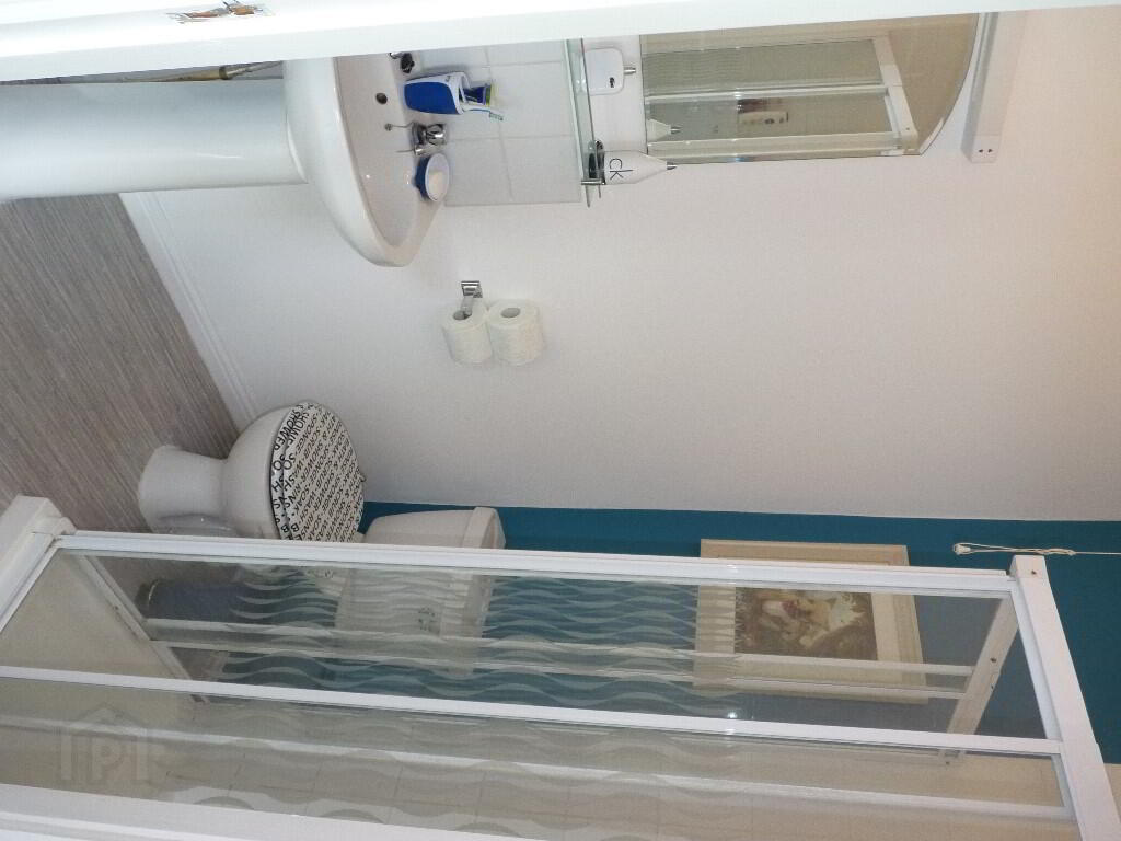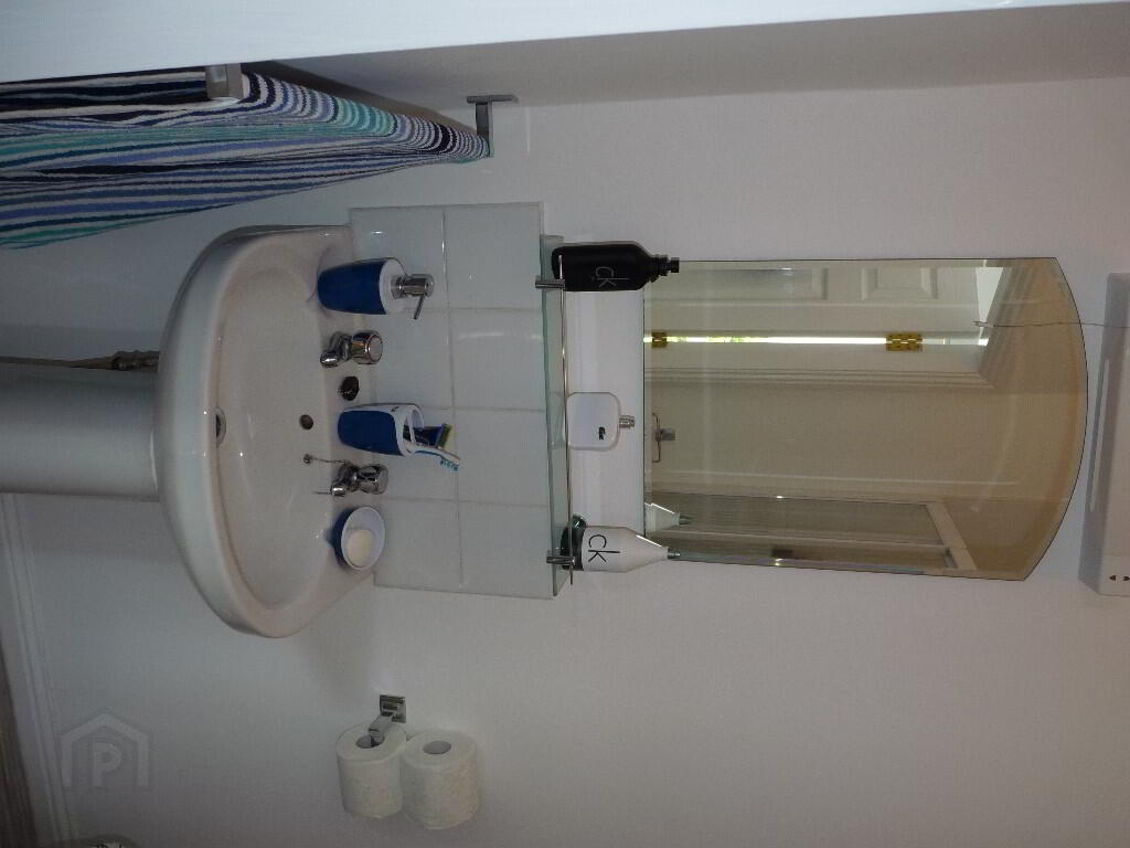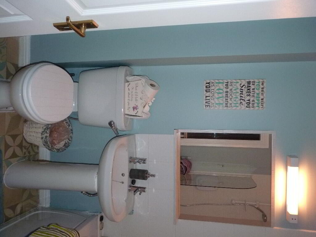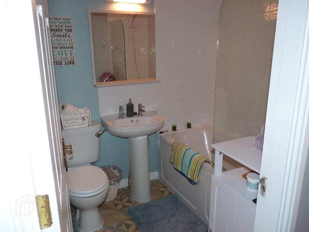 Bath with overhead shower and screen. Tiled splash back. W.c., w.h.b., wall mirror and shelf, electric wall light and shaver point, lino to floor.