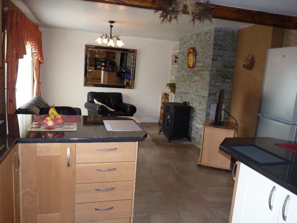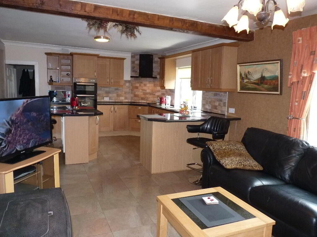 Open plan area with newly installed fitted oak wall and base units in kitchen and appliances, attractive brick splash back, double oven, hob and over-head cooker hood, integrated Kenwood dishwasher, window overlooking garden, coving to ceiling, tiled floor. Kitchen island with drawers and great storage. Fuse board. Feature beam to ceiling dividing room into Living Room area with feature stone fireplace and stove with back boiler to heat radiators and water. Built in log storage cabinet and shelving. Patio doors to garden.