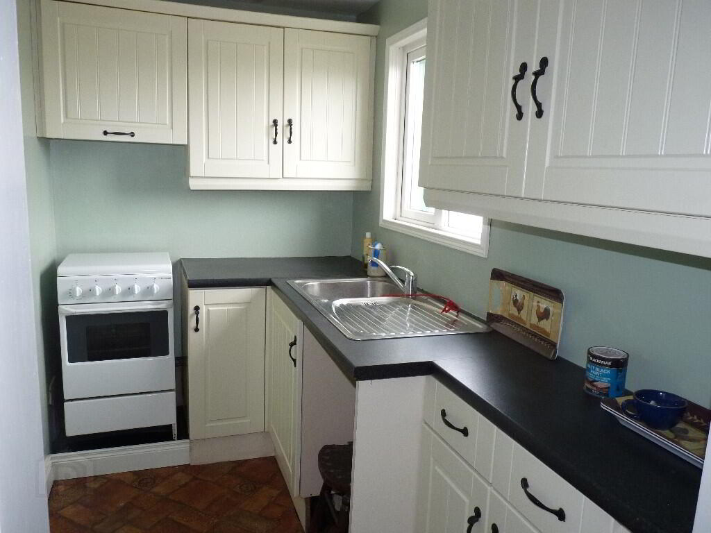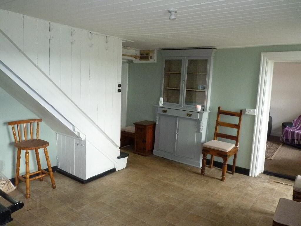 Solid fuel range, built in original dresser, staircase with under stairs storage cabinet, walls part timber clad, timber tongue and groove panelled ceiling, telephone point, lino on floor, radiator, window to rear.