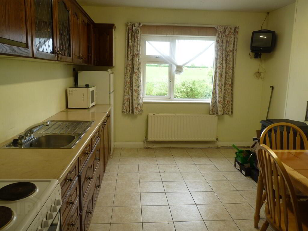 Window to front, tiled floor, solid fuel stove with back boiler for central heating (oil fired option available also). Range of wall and base units, stainless steel sink, extractor fan.