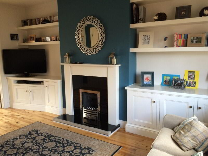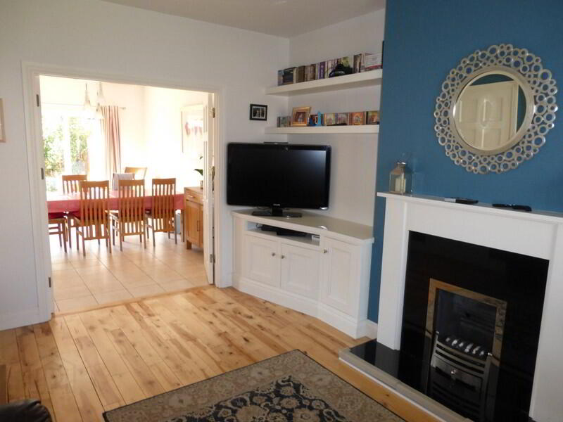 Living room - 5.5m x 3.8m Gas fire, double doors leading out into the kitchen/dining area. Solid timber floor, integrated presses and shelves.