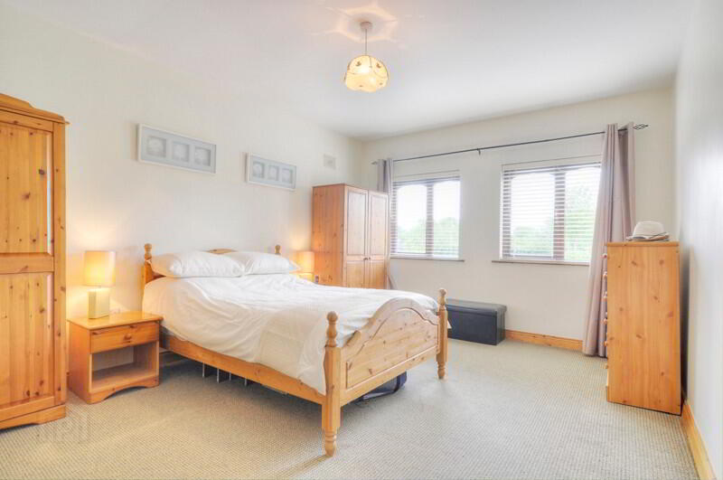 MASTER BEDROOM (4.837m x 3.636m) Bright double bedroom overlooking the front gardens and complimented with En Suite. En Suite: (1.138m x 2.408m) Fitted with W.H.B. , W.C., Electric shower.