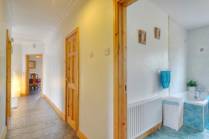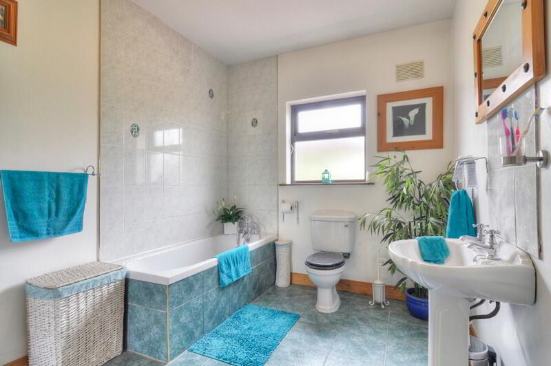 BATHROOM: (5 sq. m) Spacious and finished with partially tiled walls and fitted with Bath, W.H.B, and W.C.