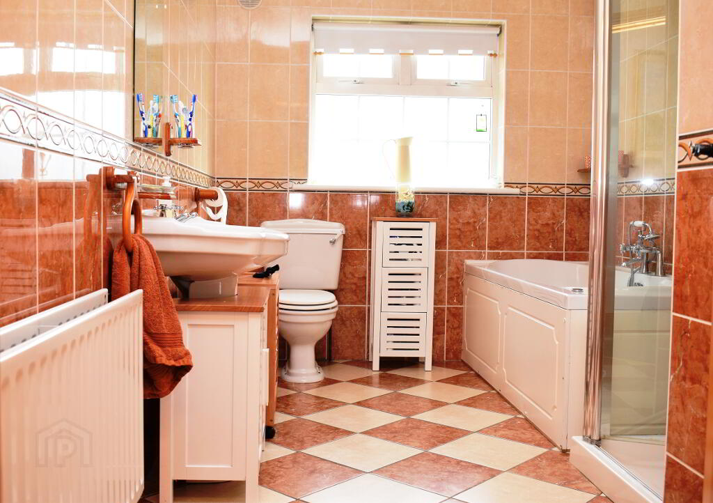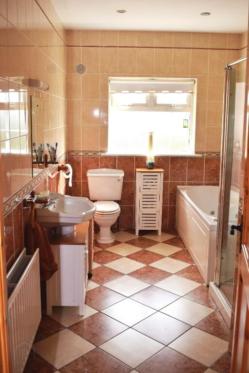 Main Bathroom: 4.00m x 2.30m Large Bathroom area finished with tiled walls and floor. Fitted with jacuzzi bath, separate Shower cubicle with electric shower, WHB and Toilet.