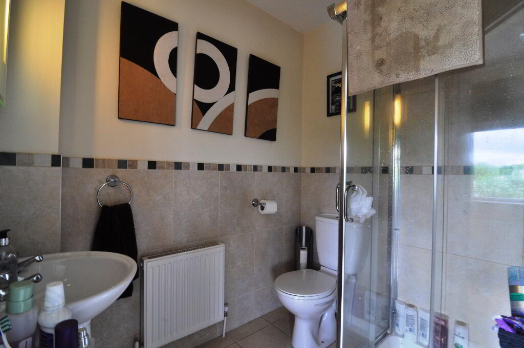 Bedroom 3 (2.862m x 4.875m) Master bedroom overlooking the back garden, features integrated storage robes. Ensuite (1.942m x 1.586m) Partially Tiled, glass shower cubicle fitted with power shower, W.H.B. and W.C.