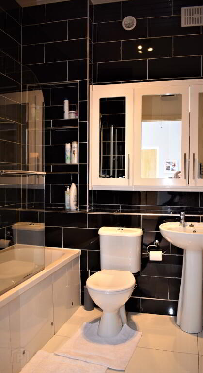 Fully tiled walls and floor and amply sized. The recess lighting is particularly attractive. Fitted with Bath and over-bath shower, WHB, Toilet and Extractor.