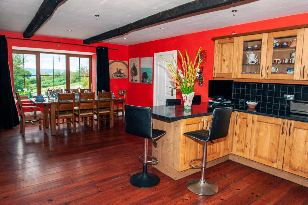 Kitchen / Dining room—Fully fitted maple kitchen with black worktops. French pine flooring with old style wooden beams in ceiling. Waterford Stanley stove with multiple power points and spotlighting.