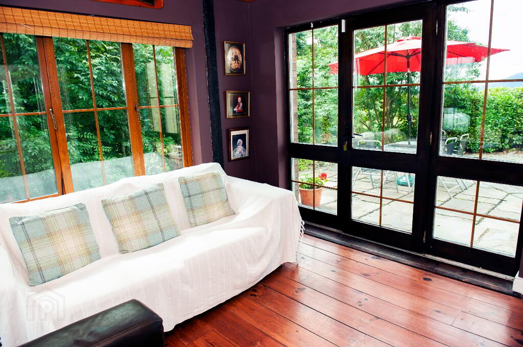 Conservatory / Sun room—Pine flooring with French doors leading to patio area at the front. Panelled timber ceiling