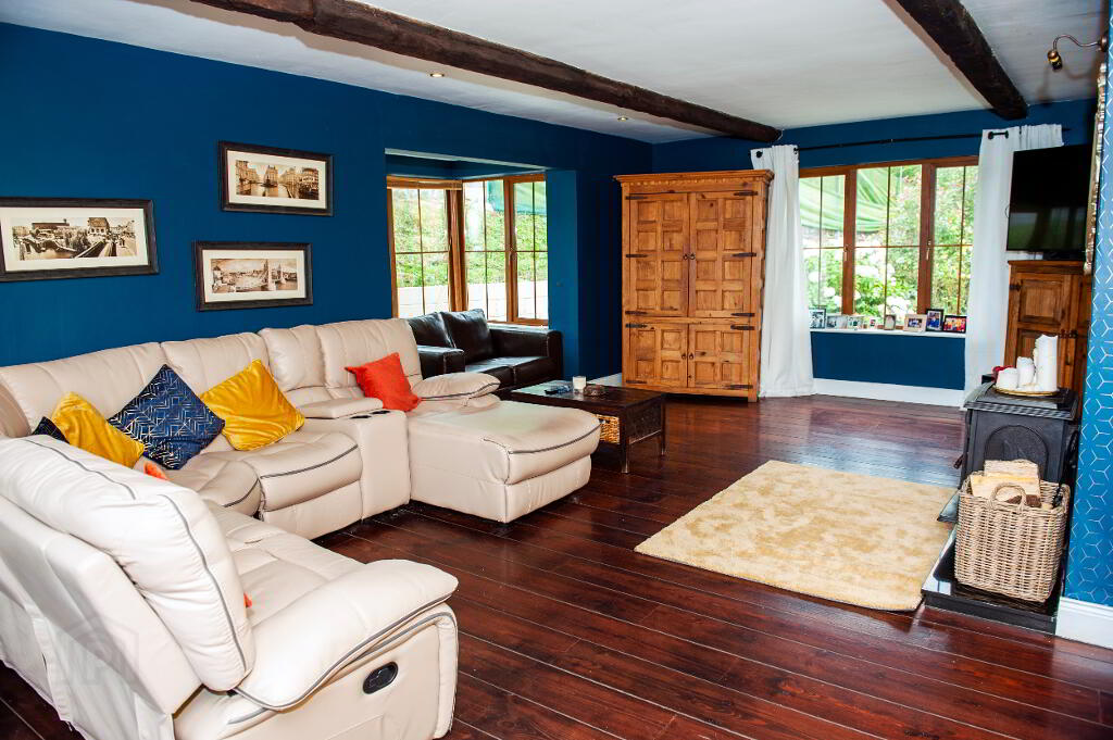 This modern old style property has a spacious ground floor layout with three reception rooms, wood beamed ceilings and beautiful glass conservatory.