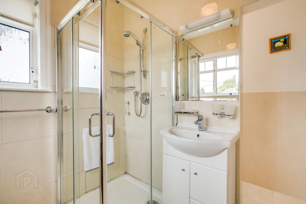 Family Bathroom: with fully tiled step-in shower with glass doors, vanity wash hand basin with fitted mirror and strip lighting, ceramic tiled walls and floor, heated towel rail, understairs storage.