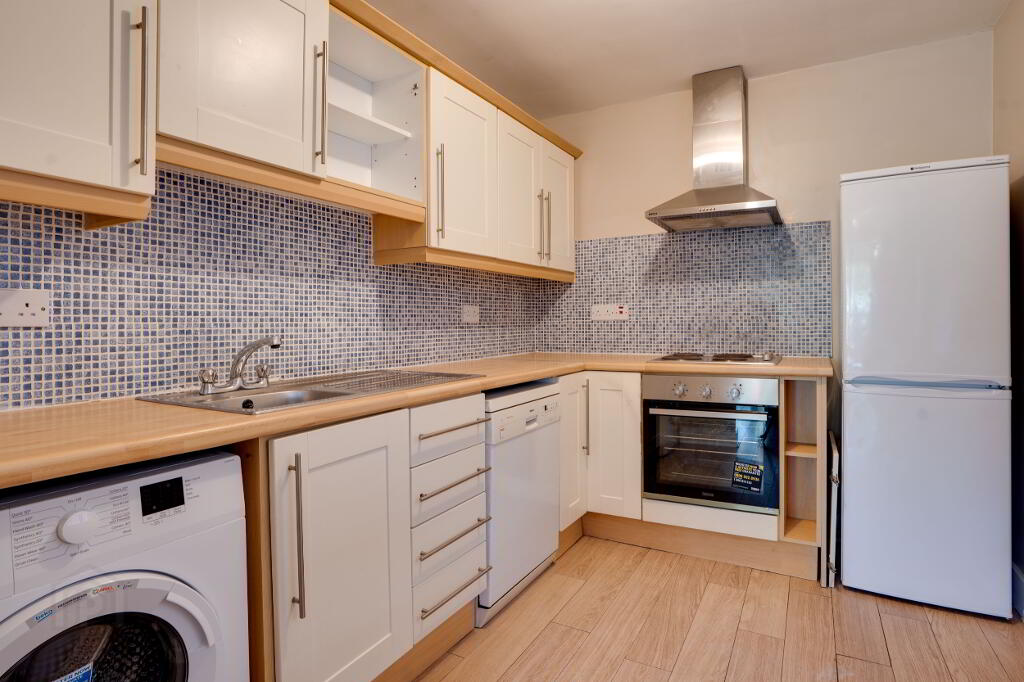 Kitchen: 3.06m x 2.34m, with range of built-in units and worktops, Zanussi oven, Beko four ring hob, stainless steel extractor fan, Bosch dishwasher, Beko washing machine stainless steel sink unit, mosaic tiled splashback, tiled floor, window to side