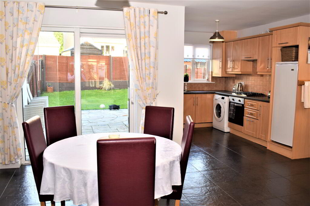 Kitchen with dining area: Particularly spacious area. Fitted Kitchen floor and eye-level units with ample space to expand if desired. Large dining area linking to the external patio space. Finished with slate tiles.