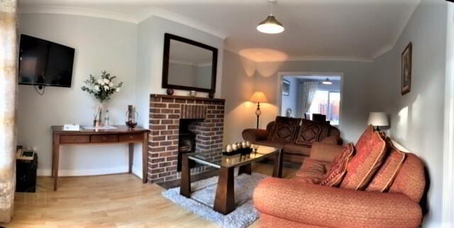 Living area: Feature fireplace with Solid Fuel Stove. Open-plan connection to the Dining and Kitchen areas. Finished with timber flooring.
