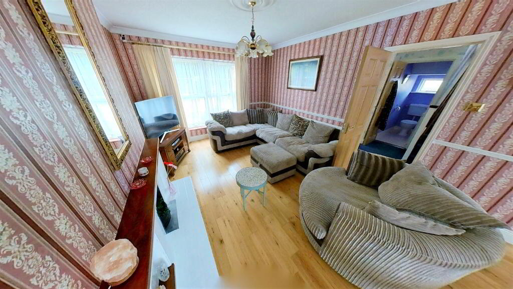 Large dual aspect reception room with feature fireplace, carpeted floor, coved ceiling, patio doors to rear garden.