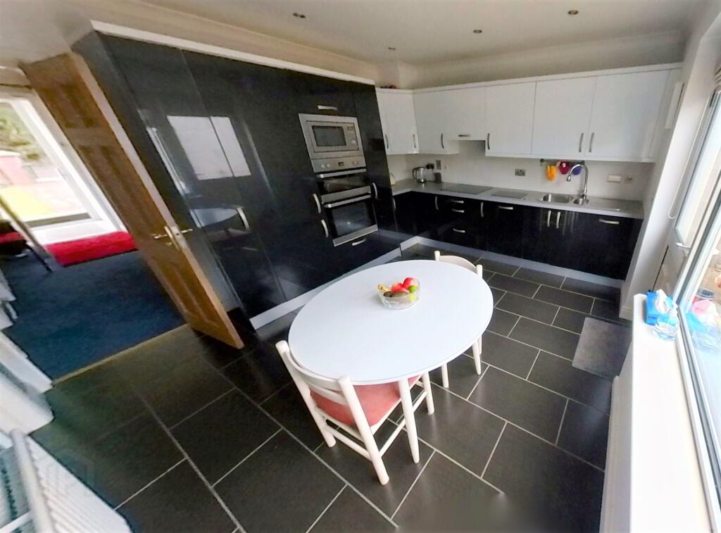 Newly fitted two tone high gloss fitted floor and wall units, with feature larder presses and Lemans corner unit base unit, pull our bin, Integrated dishwasher, fridge freezer, recess lighting, coved ceiling, tiled floor and splash back, access to rear garden.