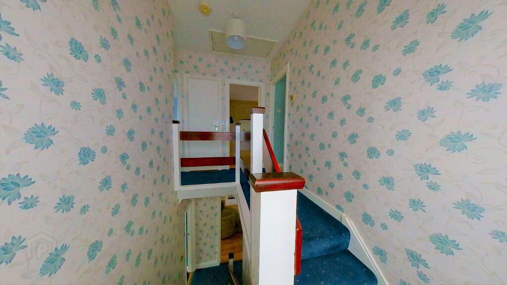 Entrance porch and hallway with carpeted hall, stairs and landing.
