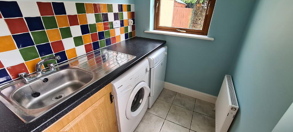2.35m x 1.57m Tiled floor, counter unit with cup board space and sink and drainer, washing machine, dryer, power points, tiled splash back, back door to rear garden