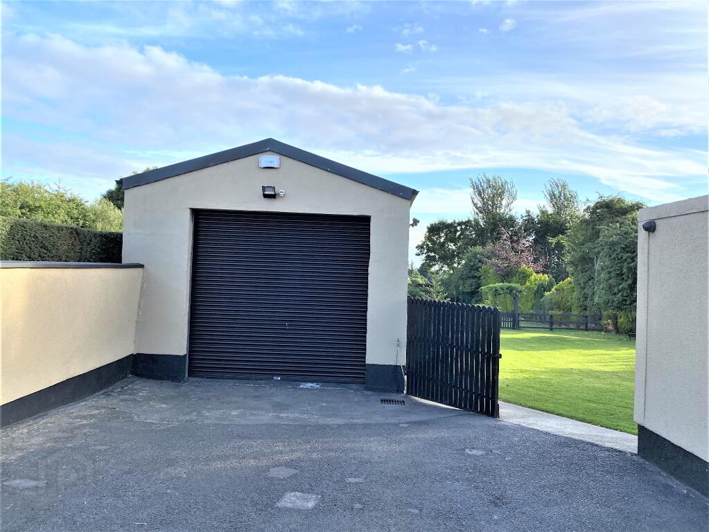 Domestic garage (10m X 5m) with electric roller shutter door.