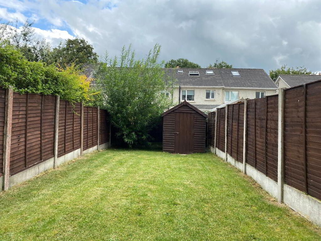 Fully enclosed rear garden with sizable lawn area and a sun-drenched aspect.