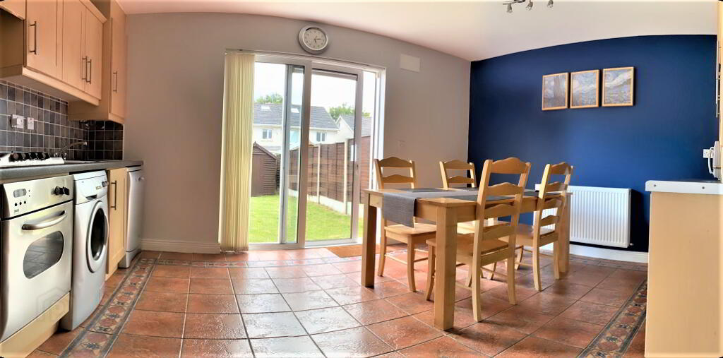 Kitchen with dining area: Very well fitted with floor and eye-level units. Family dining space. Patio doors to the external gardens. Finished with tiled floor.