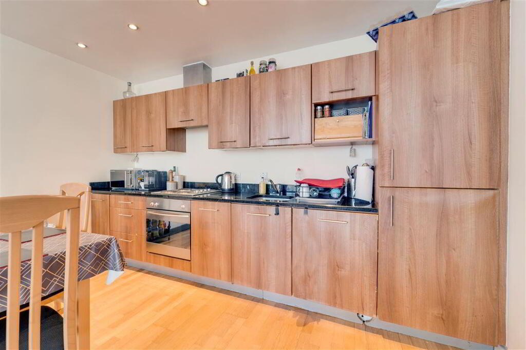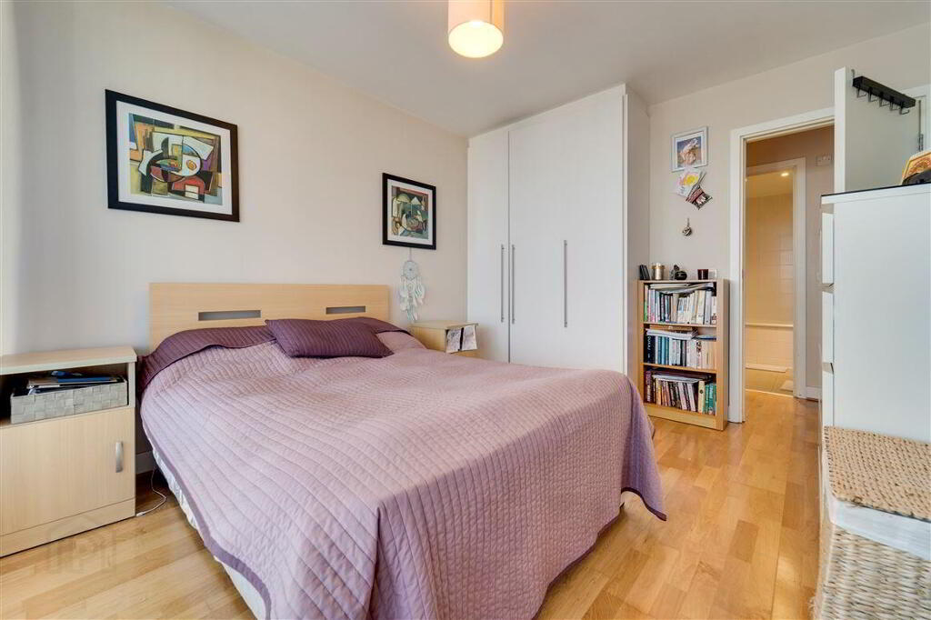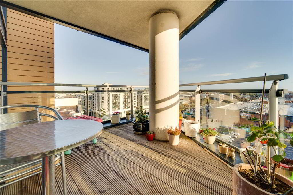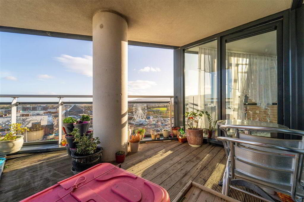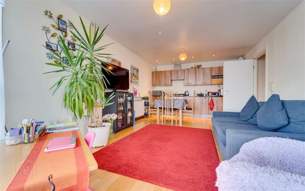 The accommodation briefly comprises a large entrance hallway with a spacious separate storage room. There are 2 large double bedrooms (with built-in-wardrobes) and access to a sizeable balcony off the master bedroom. There is also a large open plan kitchen, living and dining room with integrated kitchen units and appliances.